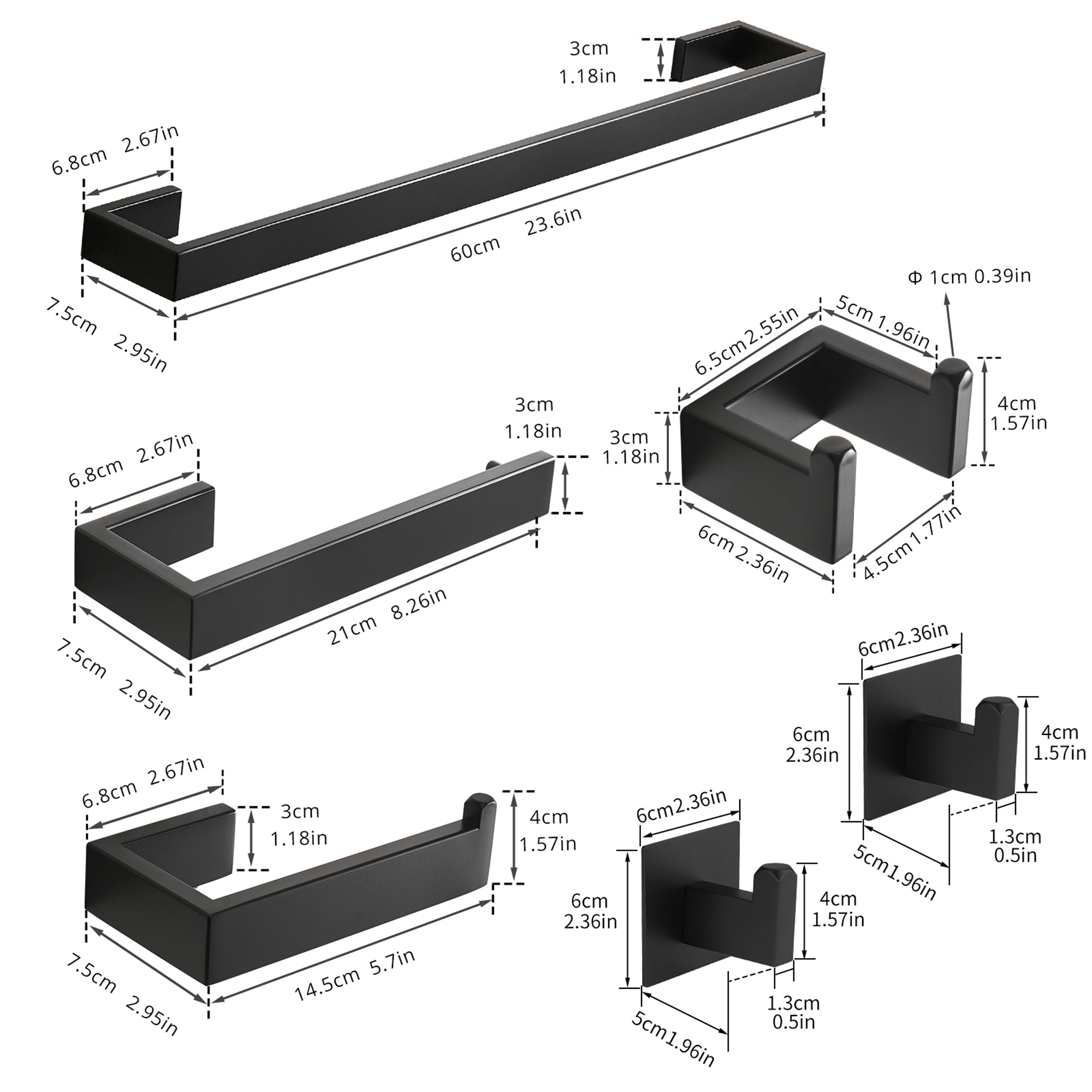 - Coming with a towel bar, a hand towel holder, a toilet paper holder, a robe hook and 2 robe hooks with 3M sticker, provide a specific place to carry your items.