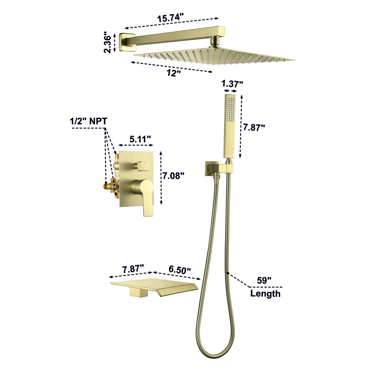 Immerse yourself in the luxurious cascade of water provided by our Rainfall Shower System. This sophisticated addition to your bathroom features a 12-inch square wall-mount shower head, coupled with a convenient 1-Spray Patterns Handheld Shower, and a waterfall faucet, controlled by a single-handle faucet. The stainless steel construction, finished in black, and brushed gold available, not only ensures durability but also adds a touch of modern elegance to your bathroom.
