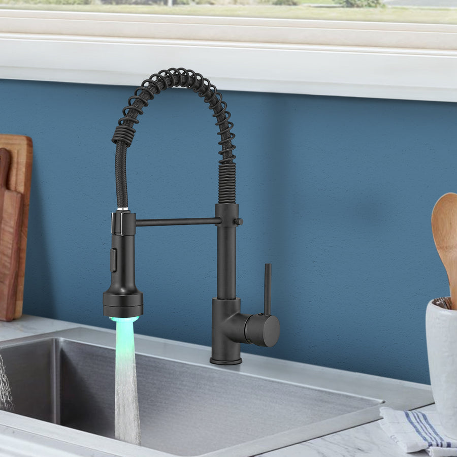 Modern Single Handle Pull Down Kitchen Faucet with LED Light Sprayer Dual Function Sprayhead in Matte Black