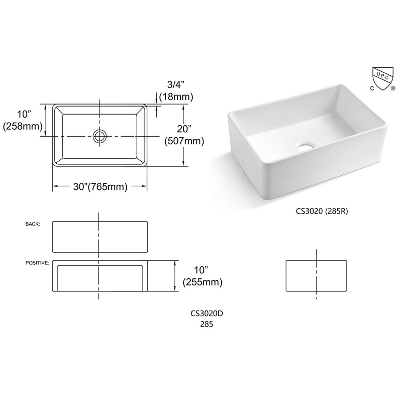The 30"L x 20"W Single Bowl Farmhouse/Apron Kitchen Sink is constructed from ceramic and minerals that are fired at 2900°F for extreme strength and durability, resistance to heat, chipping, scratch, and discoloration for years of beauty, and reliable performance. The elegant white color makes it the perfect addition to your kitchen for a lasting impression.