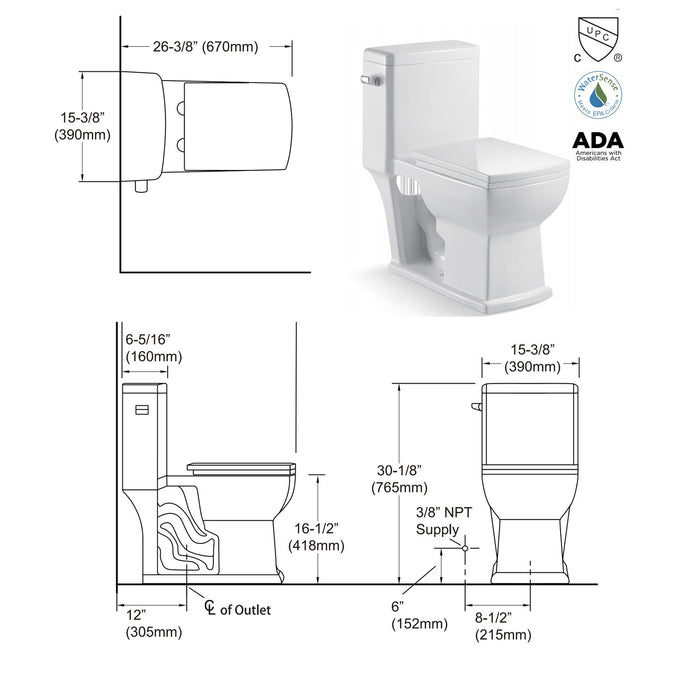 • Quiet & Powerful Siphonic Flushing: Uses 1.28 gallons (4.8 liters) per flush, saving 20% more water than standard toilets. Siphonic flushing is more powerful and quieter. Dual flush 0.8/1.28 GPF.
